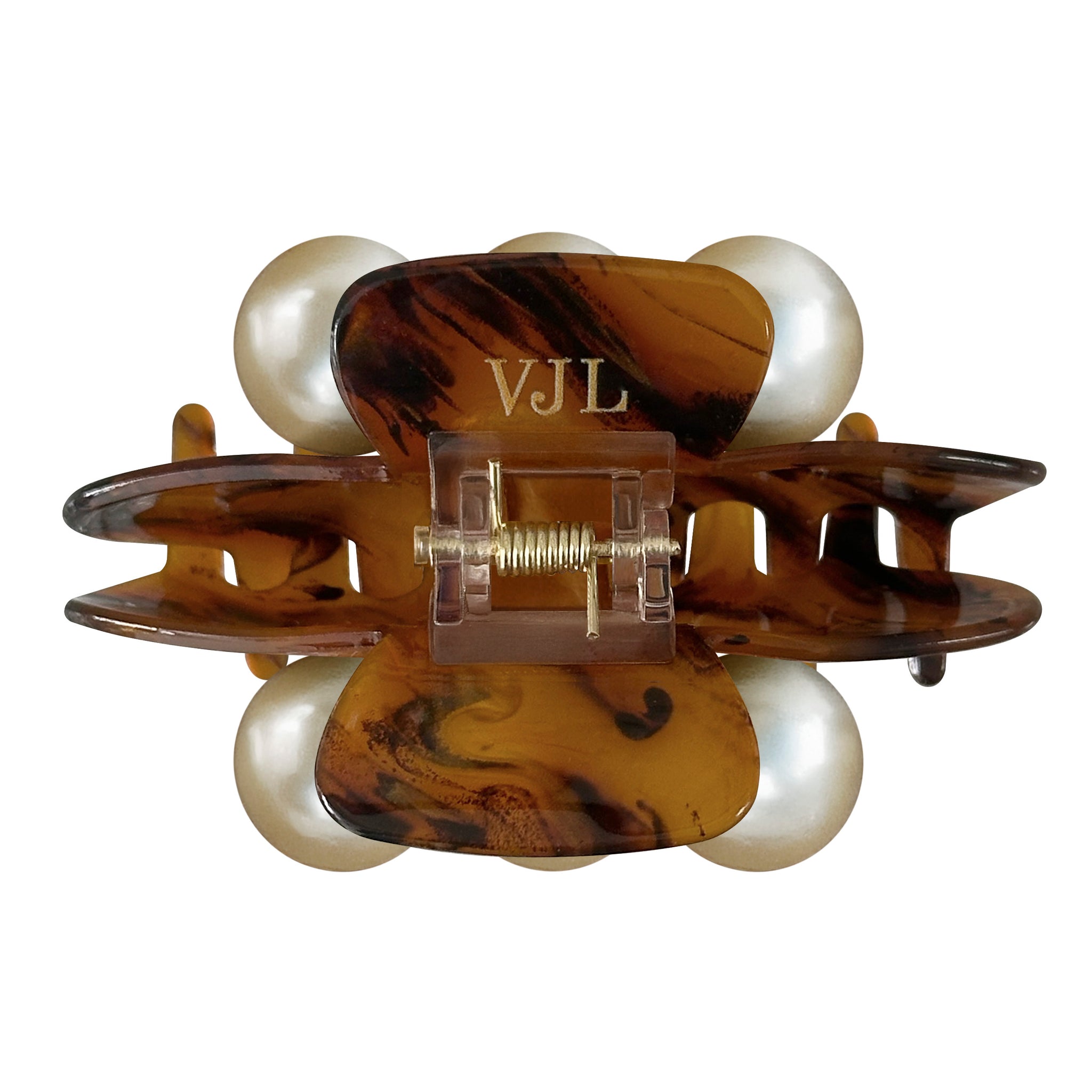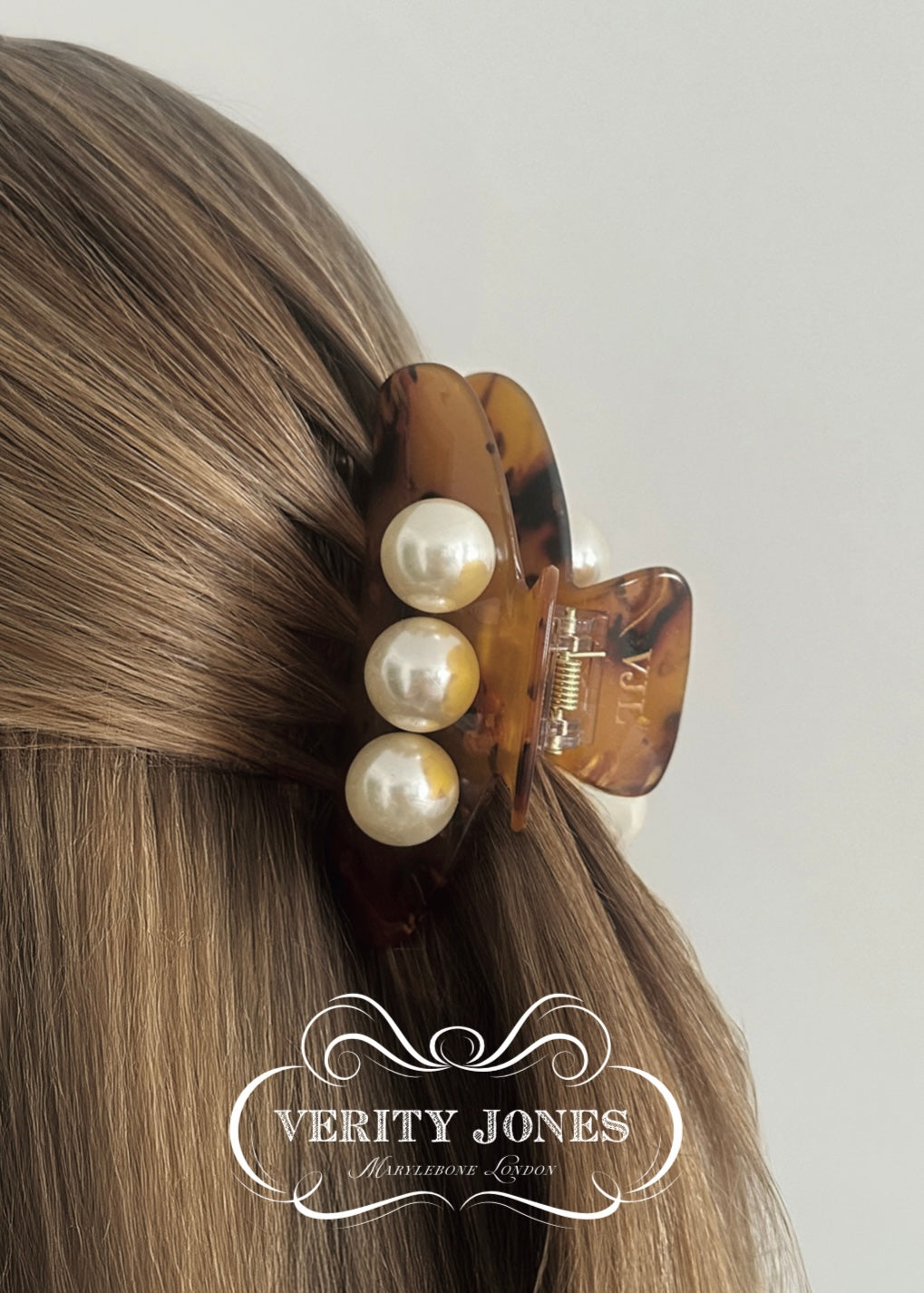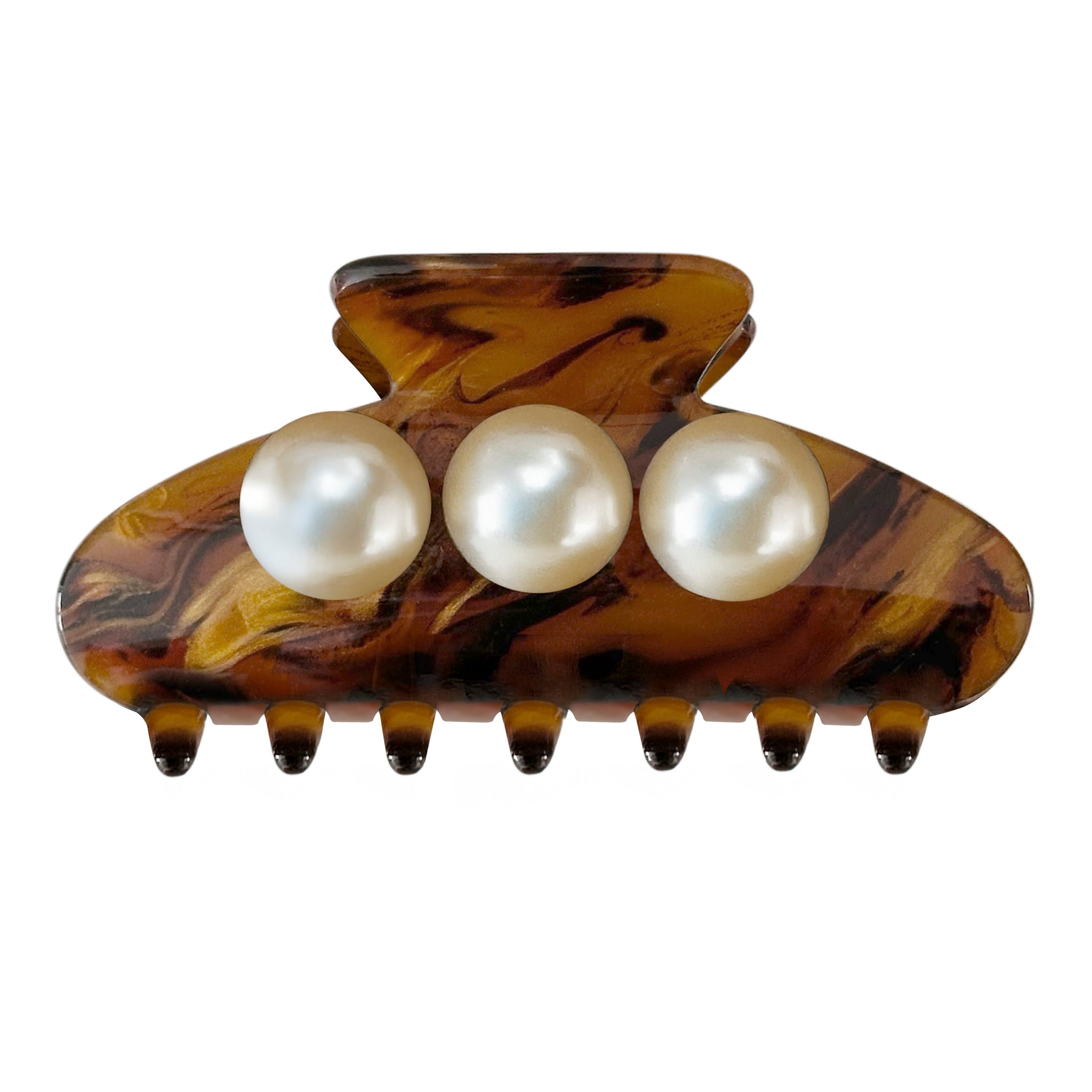 大粒のパールが3粒ついているクロー・クリップです。鼈甲とパールのコンビネーションがとても素敵なクロー・クリップです。ハーフアップでも、オールアップにしていただいても素敵です。